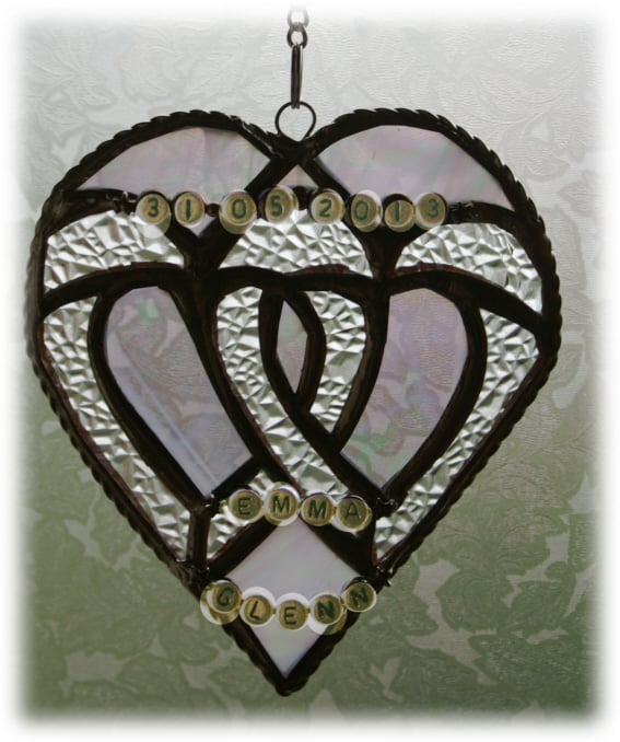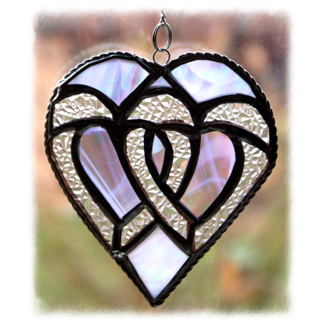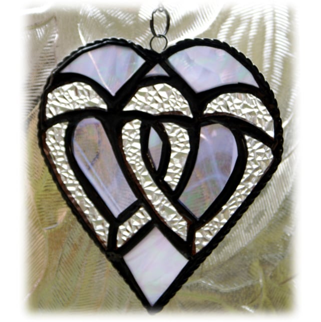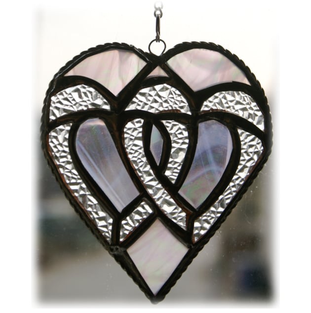 Inside an iridescent streaky white glass heart I have enclosed two Celtic style entwined hearts, these made from sparkling diamond cut glass. The result is this delightful suncatcher with an overall silver effect.