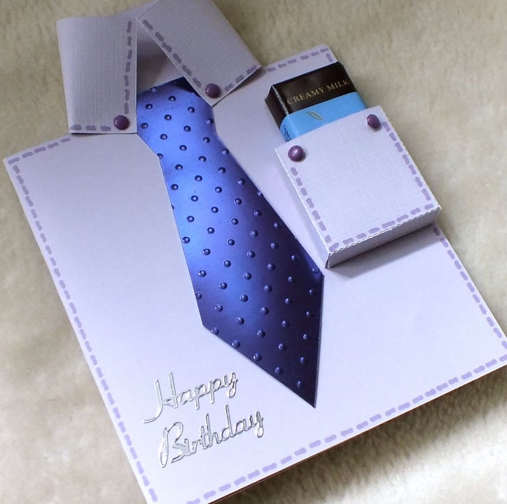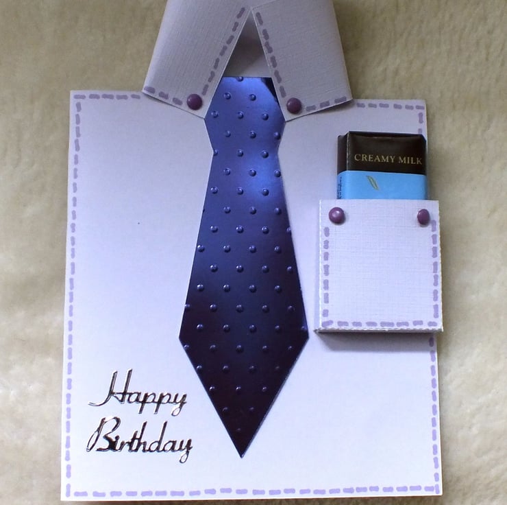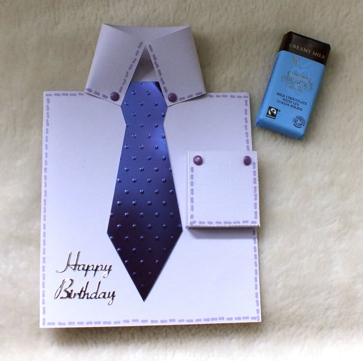 A handmade birthday card, this smart shirt & tie style card is approx. 4.5" x7", in tones of lilac and mauve, and polka dot tie. This card comes with a miniature size Green & Black's Organic creamy milk chocolate bar, which fits neatly into the shirt pocket. The card has been left blank inside for your own message.
