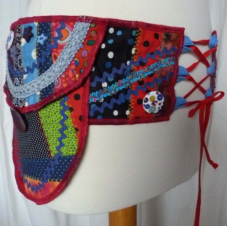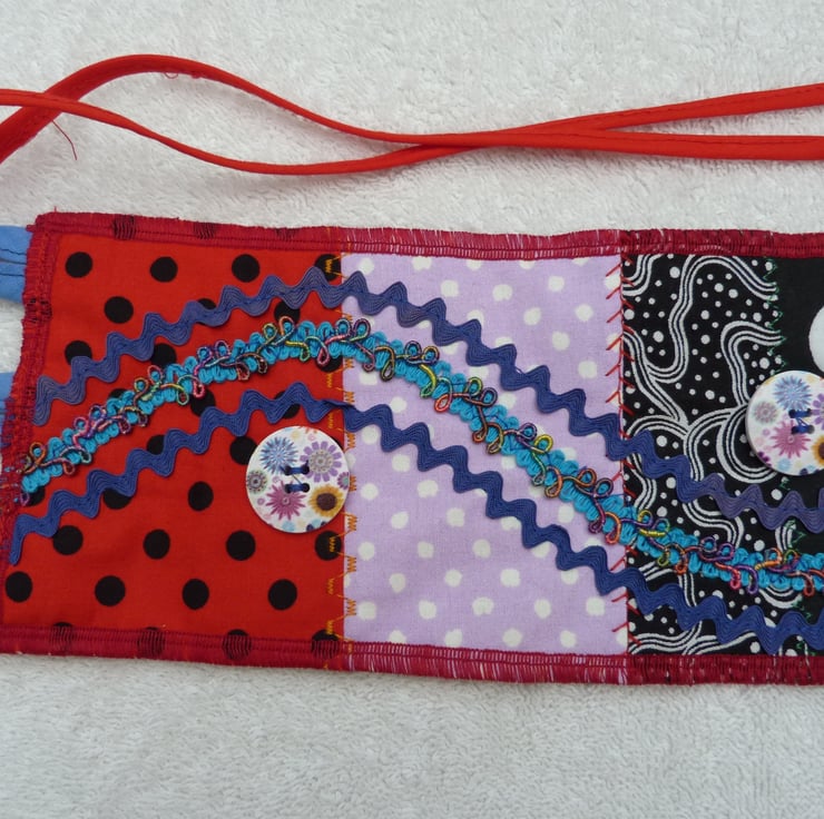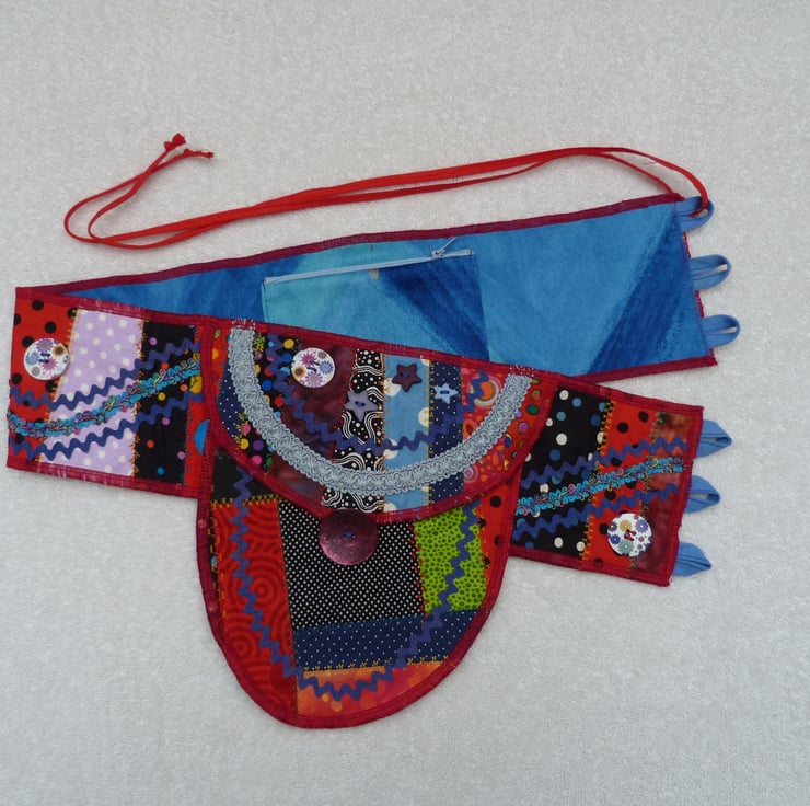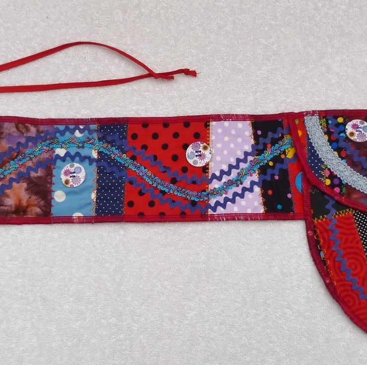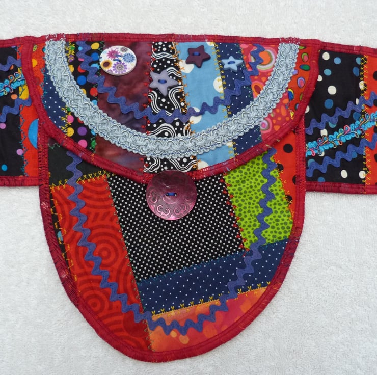 I have designed and created this bright crazy patchwork belt purse to carry your essentials. I started with a crazy patchwork base, and decorated this with embroidery stitches. It was then embellished with braid, Ric-rac and buttons.