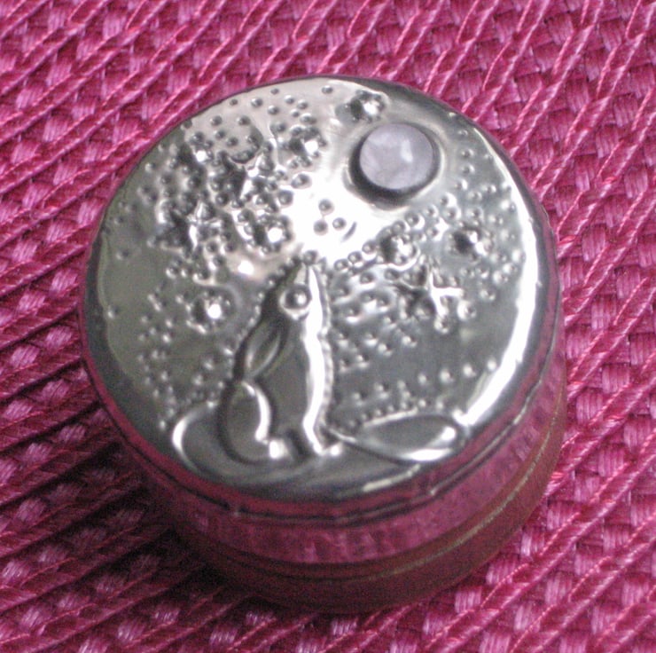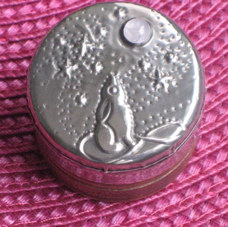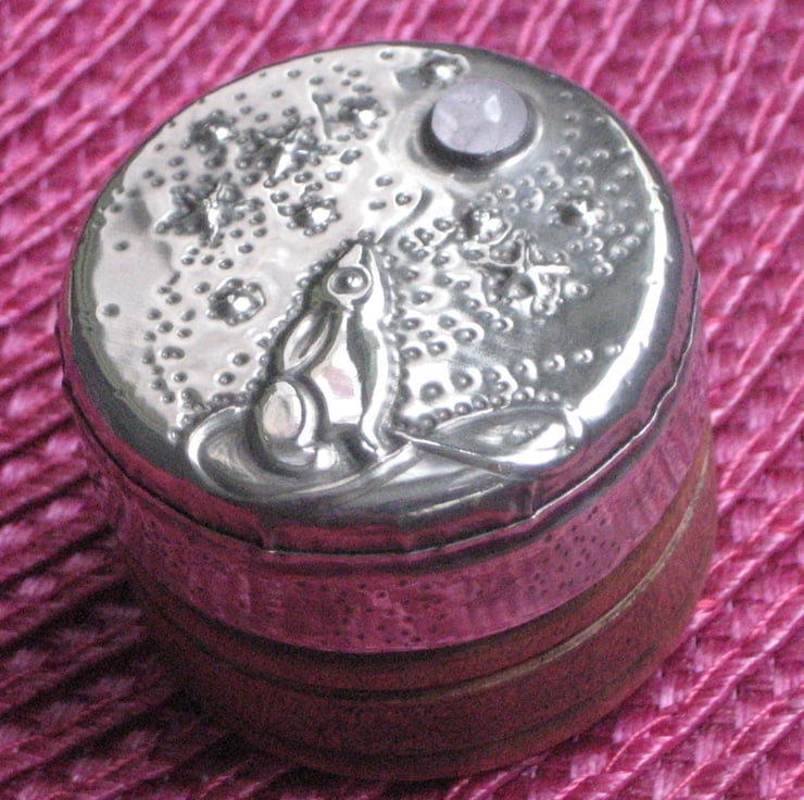 This little rustic wooden box has been transformed with a lid of hand-tooled pewter depicting the moongazing hare of legend. A very pretty rose quartz cabochon represents the moon. It is 26mm high and 36mm across. Perfect for tiny treasures. A great gift for a 10th Wedding Anniversary, Mothers' Day, Valentine's Day, Birthday or Easter.
