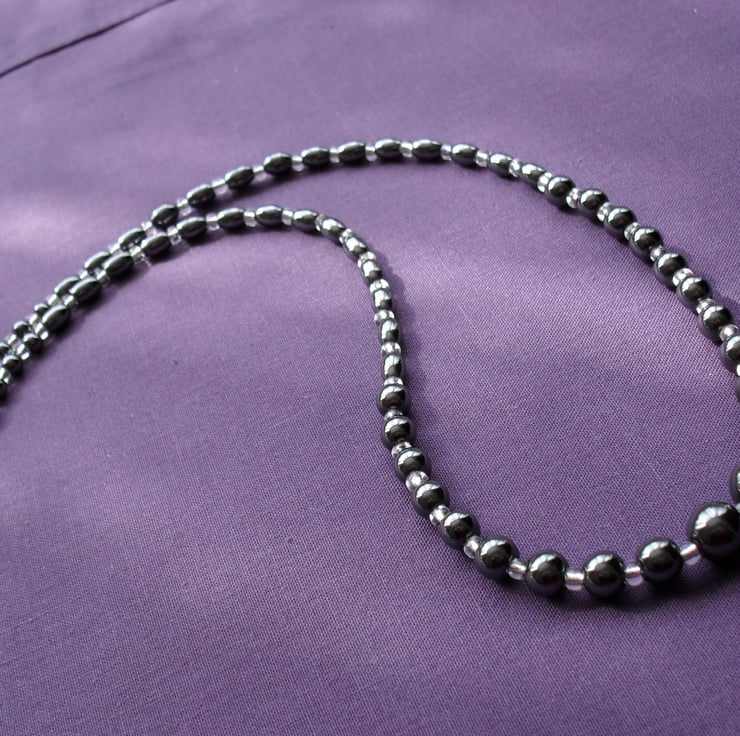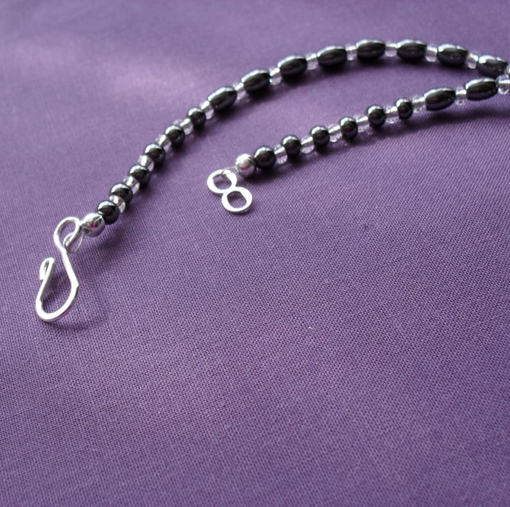 Haematite round and rice beads are beaded with small silver/white glass seed beads on beading thread onto a silver plated s shaped clasp'
