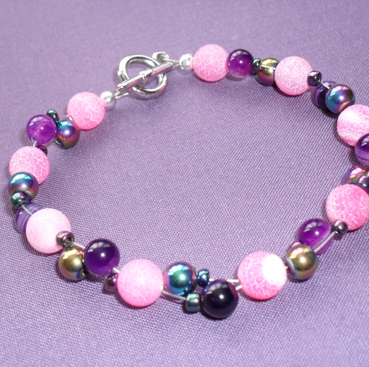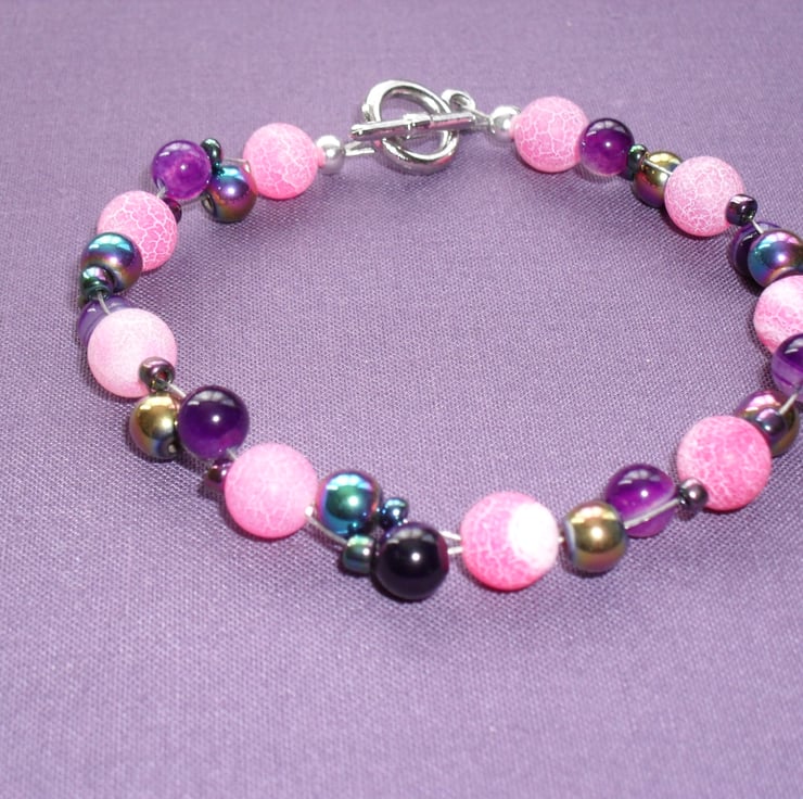 Sale was £5.95 now £3.50 Dainty bracelet of 8 mm pink frosted agate,6 mm purple agate,rainbow haematite and some small glass seed beads.with a silver tone clasp,