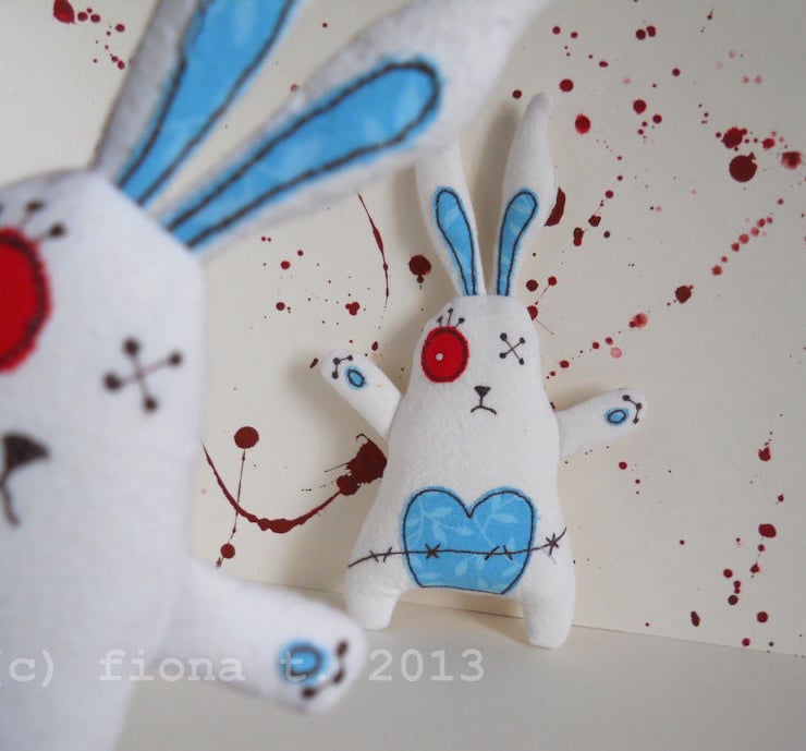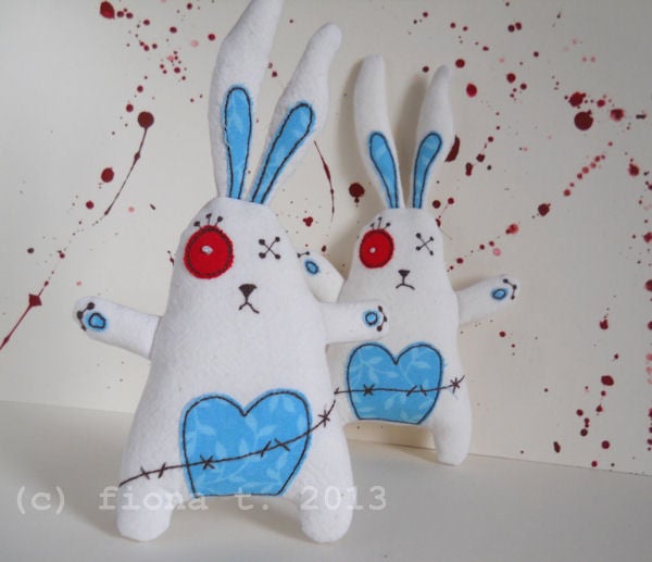 these deadly cute fabric zombie bunnies measure about 16cm (6 inches) tall from the tips of their ears to their shuffling toes.