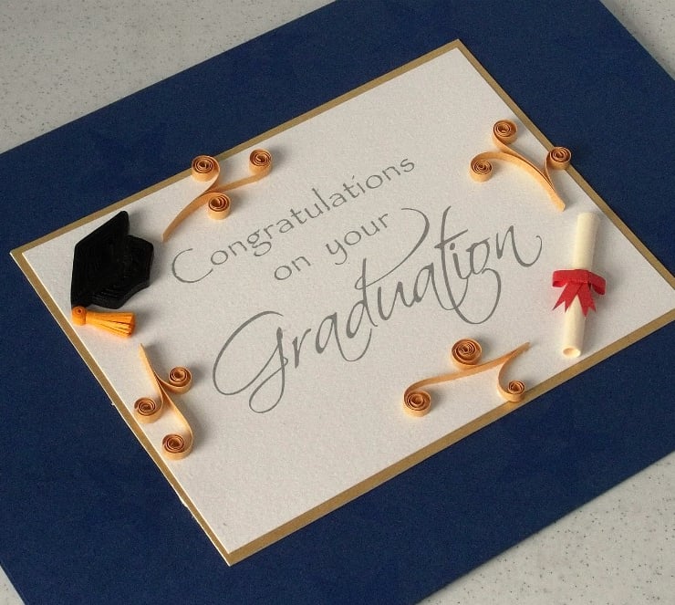 A handmade graduation card with a quilled mortar board hat and diploma, to send congratulations to a very special person.