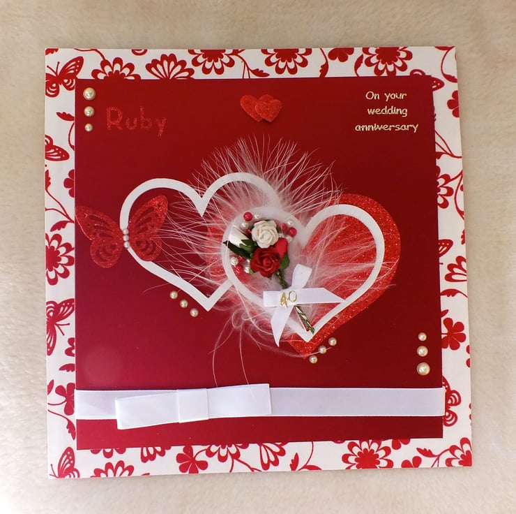A luxury handmade Ruby Wedding Anniversary card, this exquisite card is large at 8"x8" square. The main centre piece is two entwined loving hearts, embellished with roses and red glitter butterfly, on deep red satin card, backed onto red flock and lustre pearl, Christina RE 'Papillon Rouge' designer paper. Includes 'Many Congratulations on your Ruby Wedding Anniversary' sentiment inside.