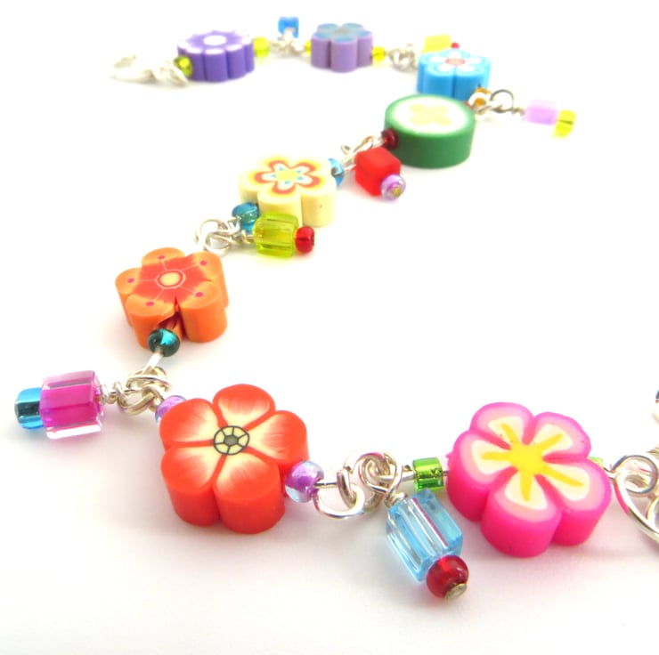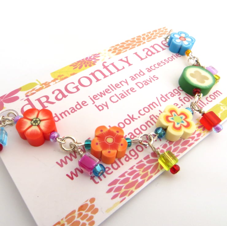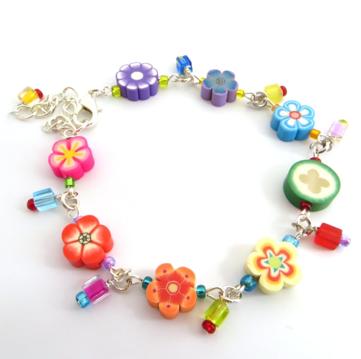 A cute bracelet featuring miniature fimo flowers in a rainbow of colours, strung with contrasting bright seed beads and teeny glass cubes to give lovely extra detail and movement.