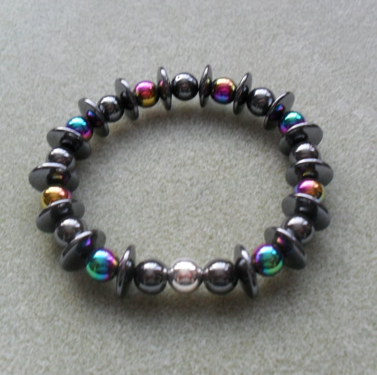 Haematite and rainbow hematite are beaded on elastic.with a silver plated bead