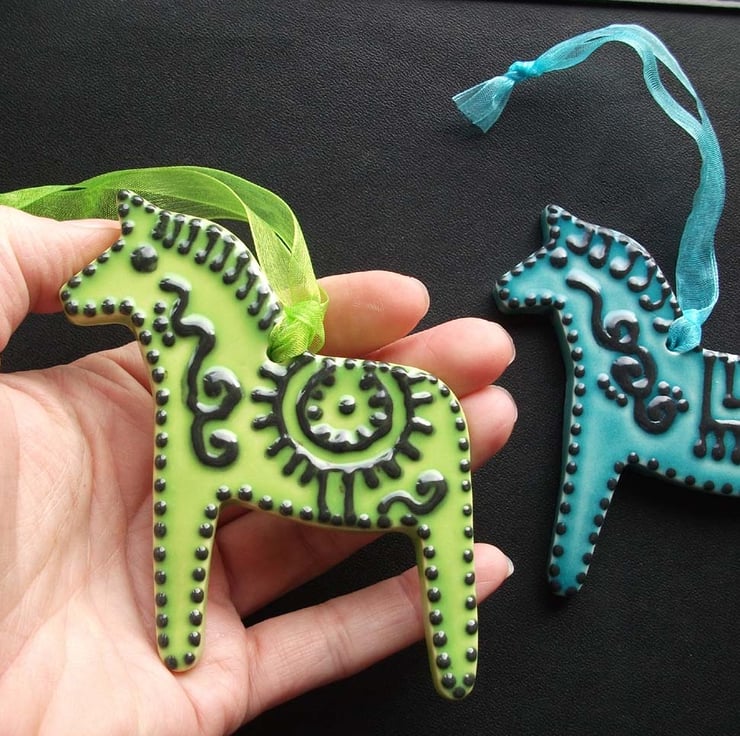 These cute little horses are cut from white earthenware clay and decorated in a folk art style.