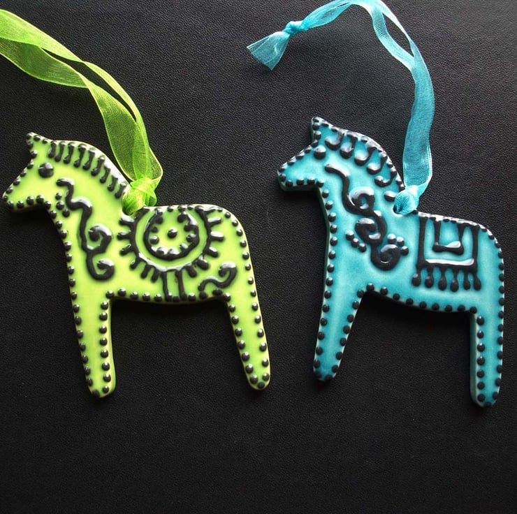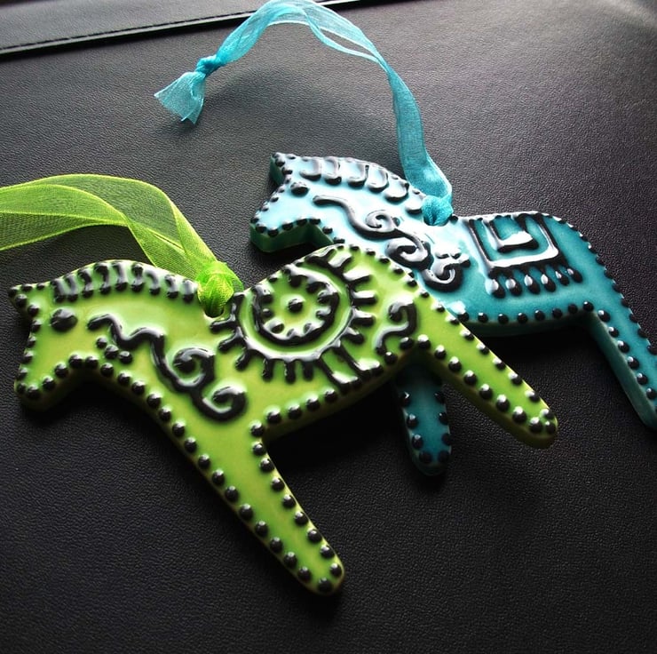 Set of two ceramic folk horse decorations