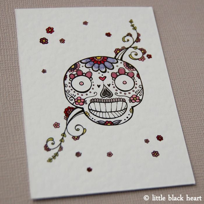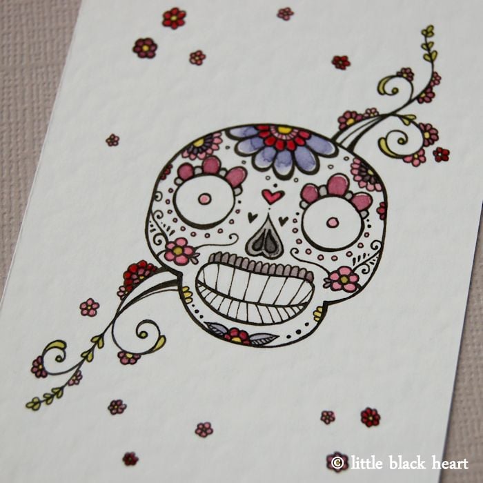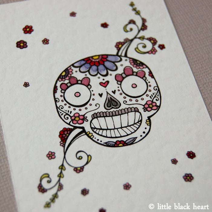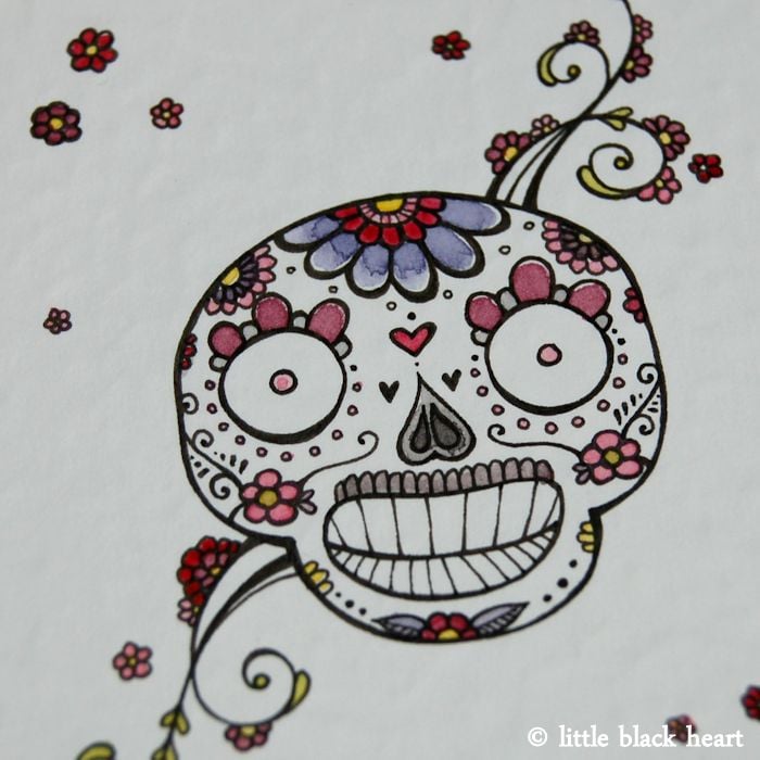 a little day of the dead sugarskull, adorned with flowers, decorative details, and swirly bits - all in cool shades of reds, blues, and purples.