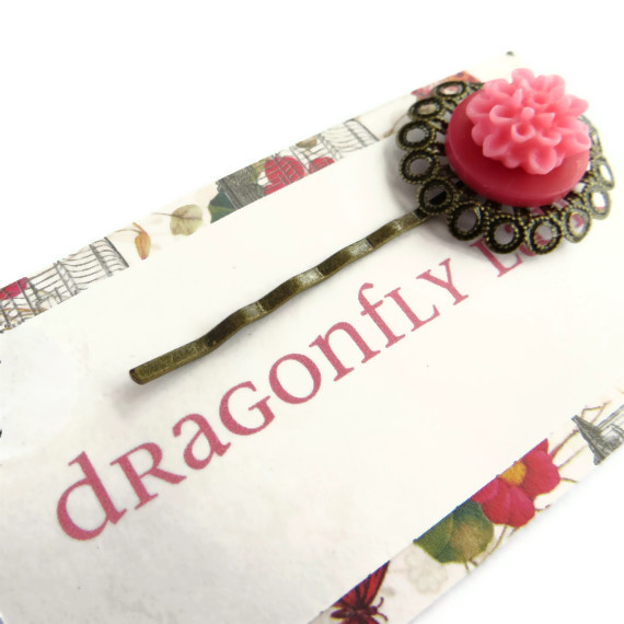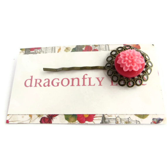 A large antique brass / bronze filigree hair pin, mounted with a bright pink button and a paler pink flower cabochon, securely glued in place with industrial strength glue.