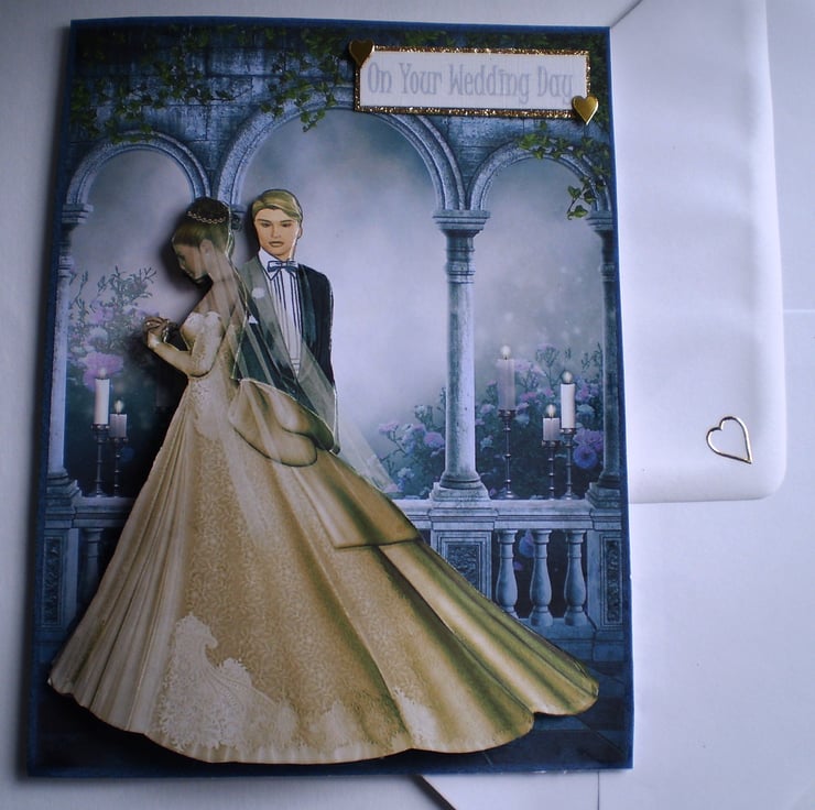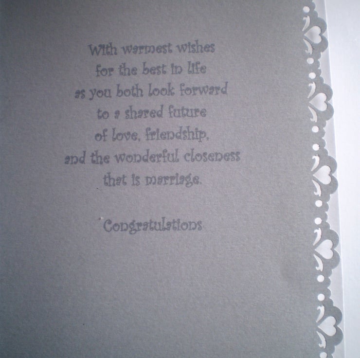 This lovely wedding card featuring a young couple has a 3D effect and measures approximately 134x175mm (5.25x7in). Insert is pearlised paper and I have used a heart decorative border. The greeting on the outside and inside can be changed
