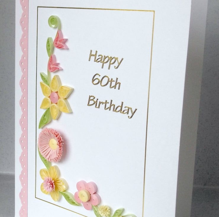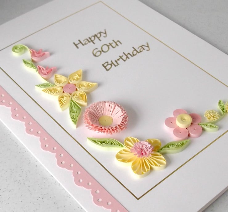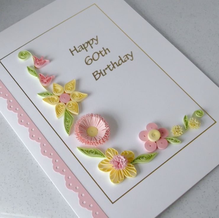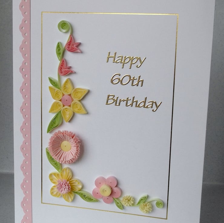 A beautiful handmade quilled 60th birthday card with quilling flowers in pretty shades of pink and lemon for a very special person.