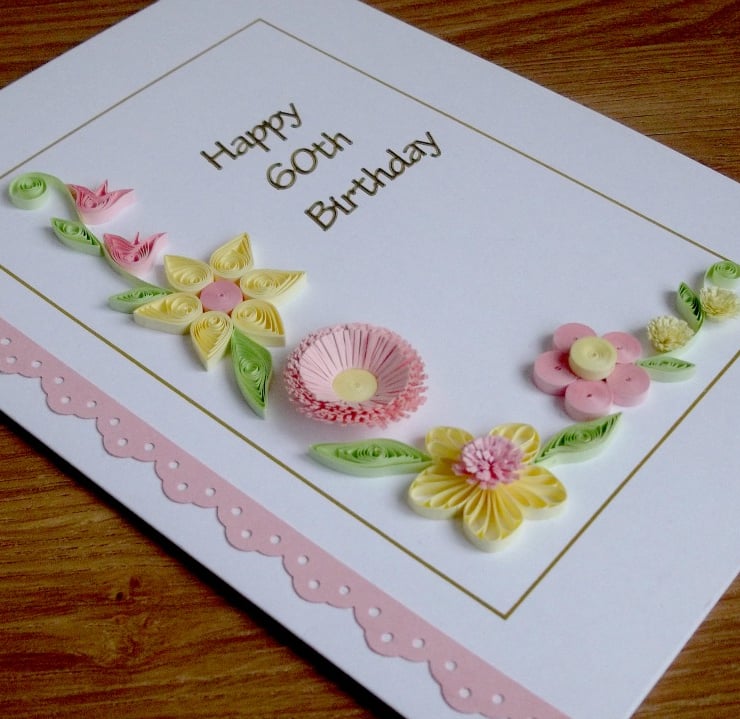 All the quilling on this card is handmade! Each petal, bloom and leaf is handrolled from strips of coloured paper. The result is a beautiful original 60th birthday card which makes a great keepsake for the future.