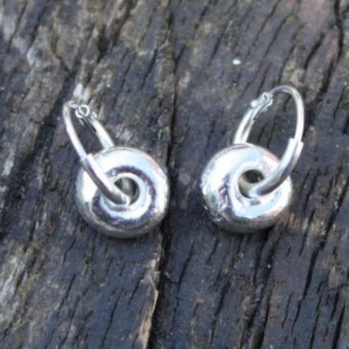 Small handmade sterling silver melted nuggets on creole hoops.