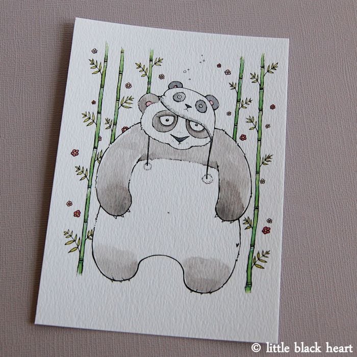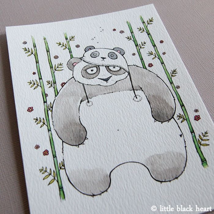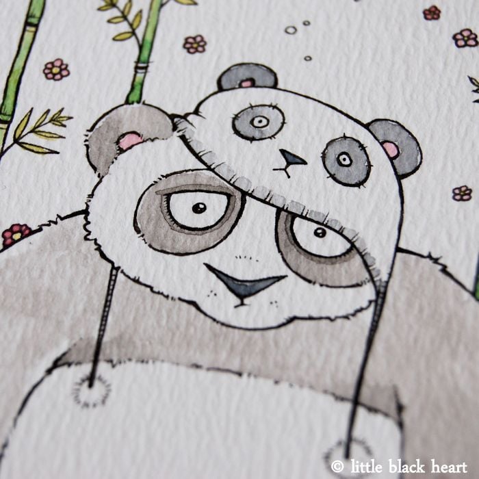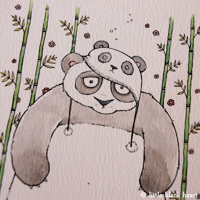 a rather disgruntled looking panda, wearing a panda hat. naturally.