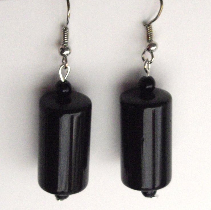 These drop earrings are all hand made from black glass cylinder beads which are just over 2 cm long and 2 x small round black beads.