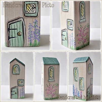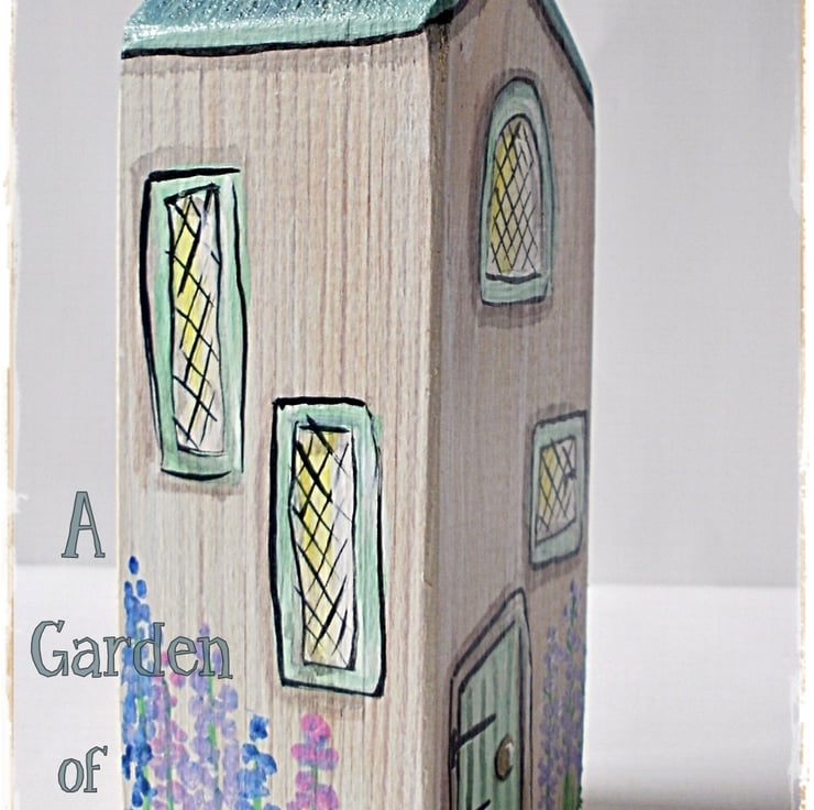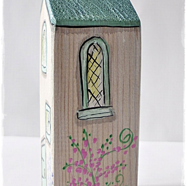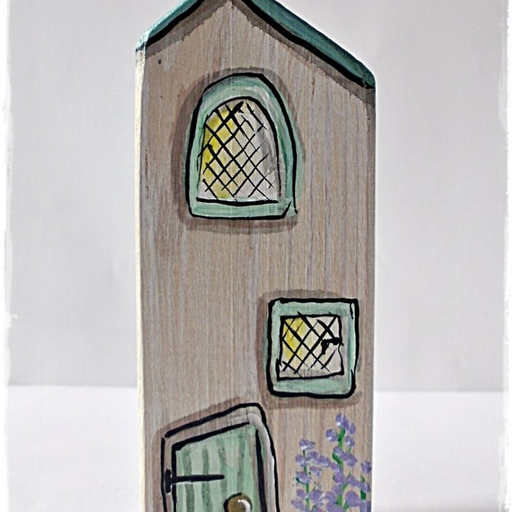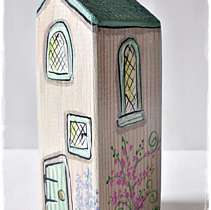 This Little Wooden House is handpainted onto block pine. It is a little Green Cottage.