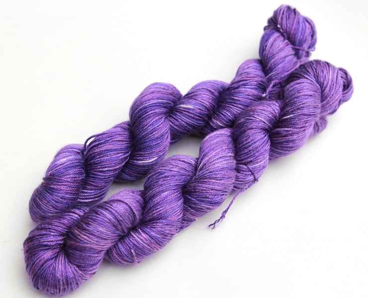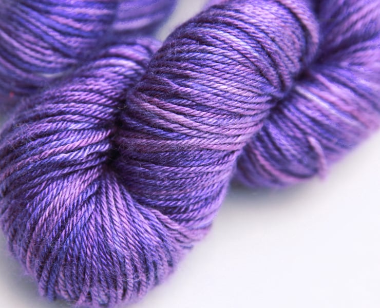 Shades of violet and lavender with some lighter sections. This is a soft pure silk yarn. There is one skein left. Please note that this yarn base comes in 50g skeins, rather than my usual 100g skeins. (Photographs have been taken and edited in bright natural light - due to the silky sheen of this yarn, it is extremely difficult to photograph accurately.)