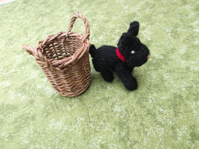 Knitted dog in a basket. Approx 6cm in sitting height. Wool stuffing.