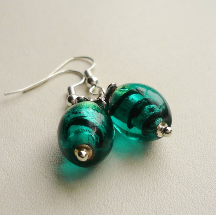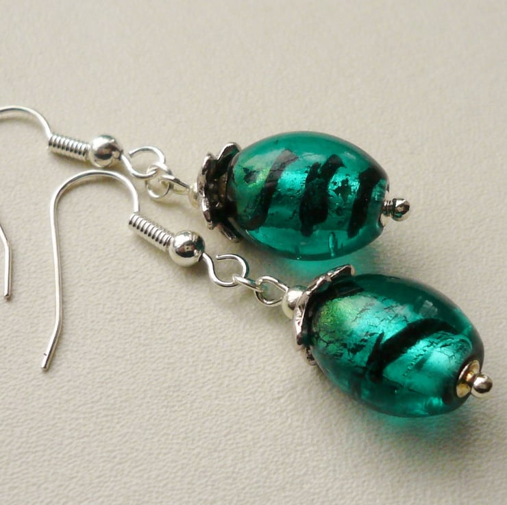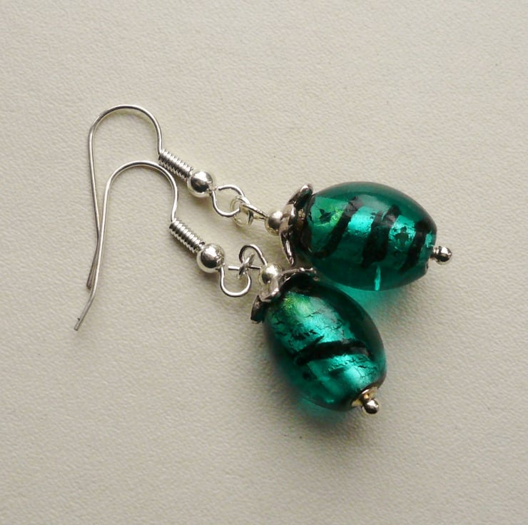 These earrings consist of 15mm long teal foil lined indian glass oval beads with silver plated bead caps. Attached to silver plated ear hooks, they measure approx 4cm incl hook.