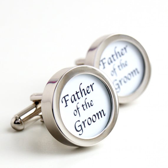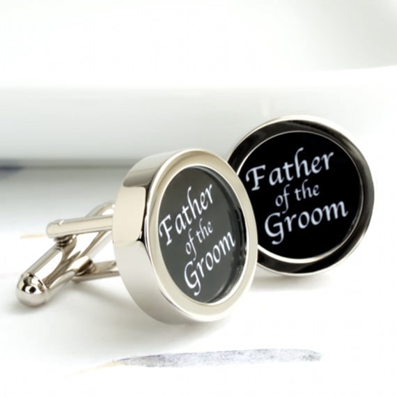 Father of the groom cufflinks in classic white lettering on a black background. Elegant and stylish, these are part of a range for all the wedding party. Also available with a white background.