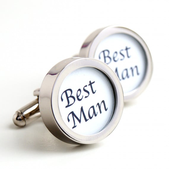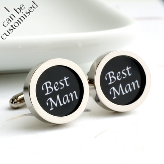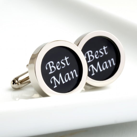 Best Man cufflinks in an elegant white letters on a black background. Elegant and stylish, these are part of a range for all the wedding party. Also available with a white background.