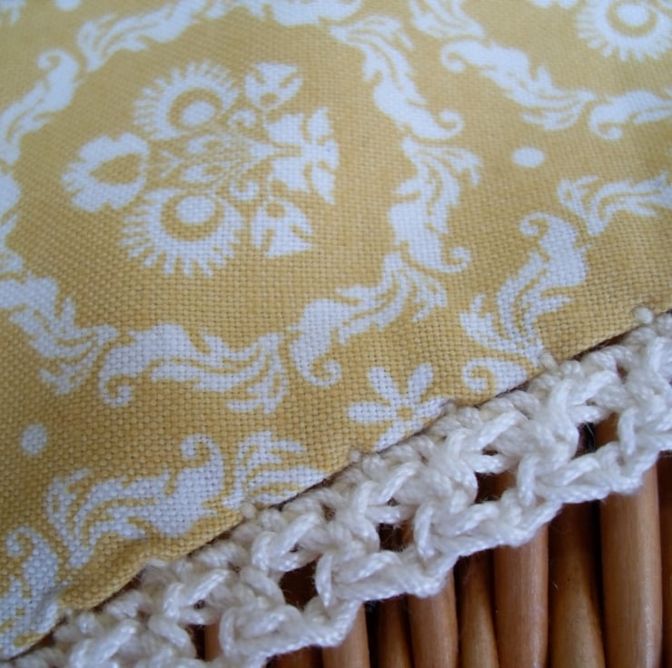 Made in my little studio at home, using a mix of cotton fabrics, which I have hand crocheted with a cream cotton yarn edging.