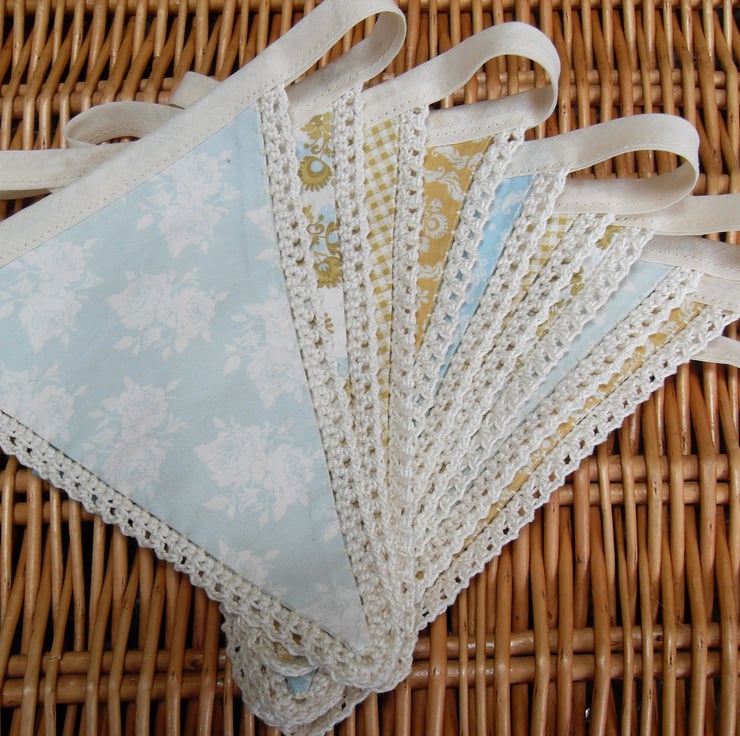 Co-ordinating cotton fabrics and a crochet edging helped to create the soft, romantic vintage feel of this charming flag bunting garland.