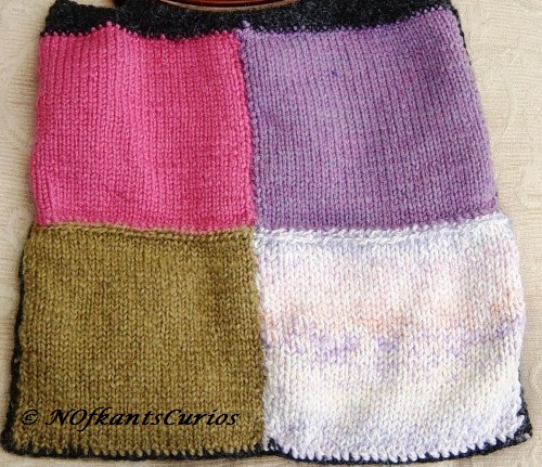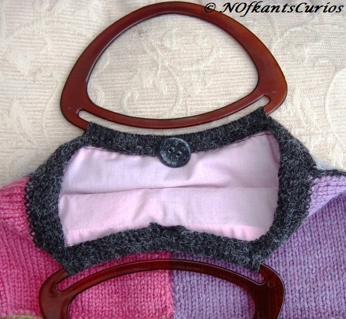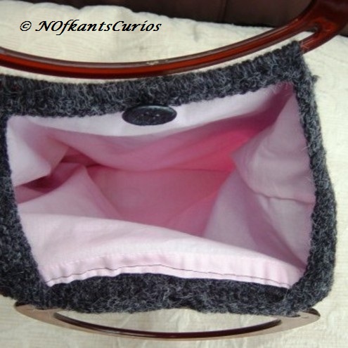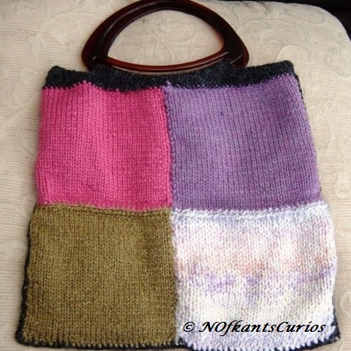 The body of the handbag is made up of eight differing coloured knitted squares, which have been hand sewn together, four patches on either side & then the edges have been crocheted together, in a deep grey yarn, which also incorporates the top edge of the handbag & is the crochet attachment yarn for the lucite handles.