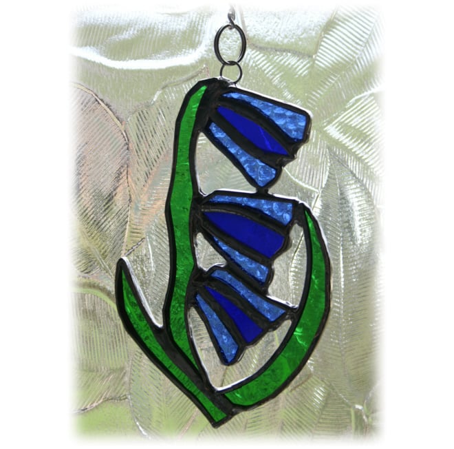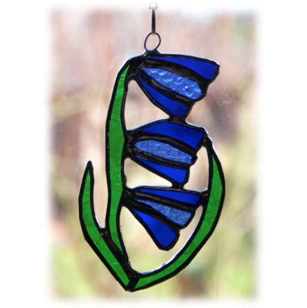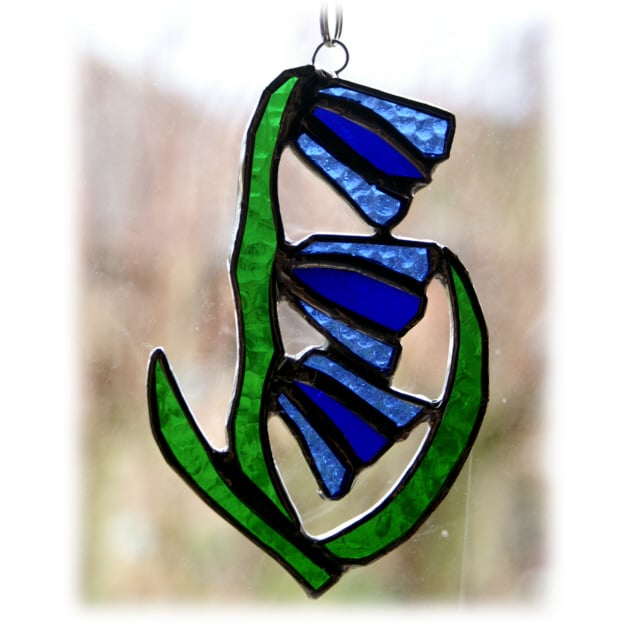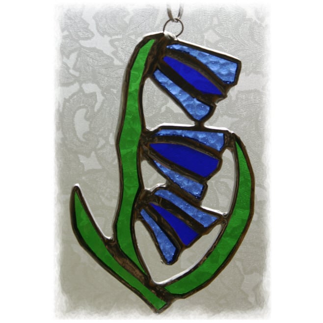 It is a simple floral design, of a beautiful bright blue flower with green strappy leaves. The three blue bells are each made from two different types of glass, one with a tiny bubble texture, the other iridescent.