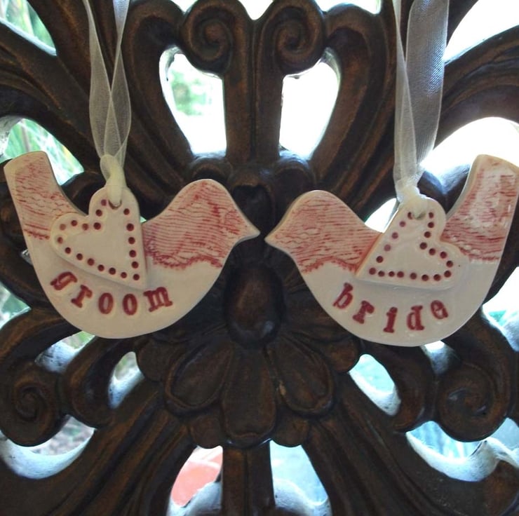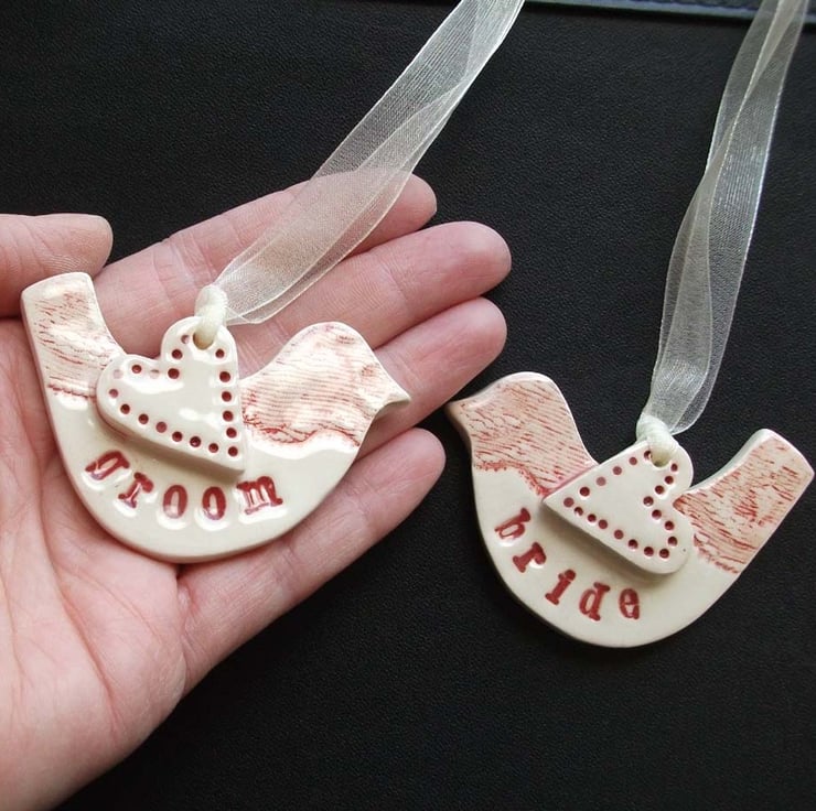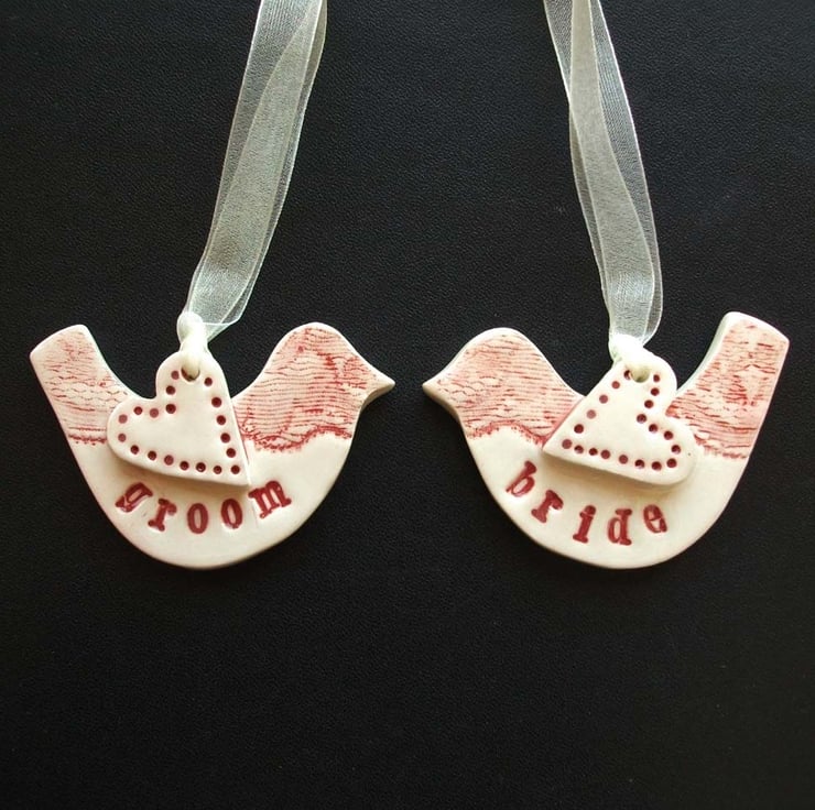 These little ceramic birds are hand cut from white earthenware clay and decorated with the words Bride and Groom.