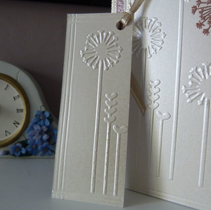 Gift tag embossed with matching dandelion on beige pearl card and finished off with gold edged beige ribbon.