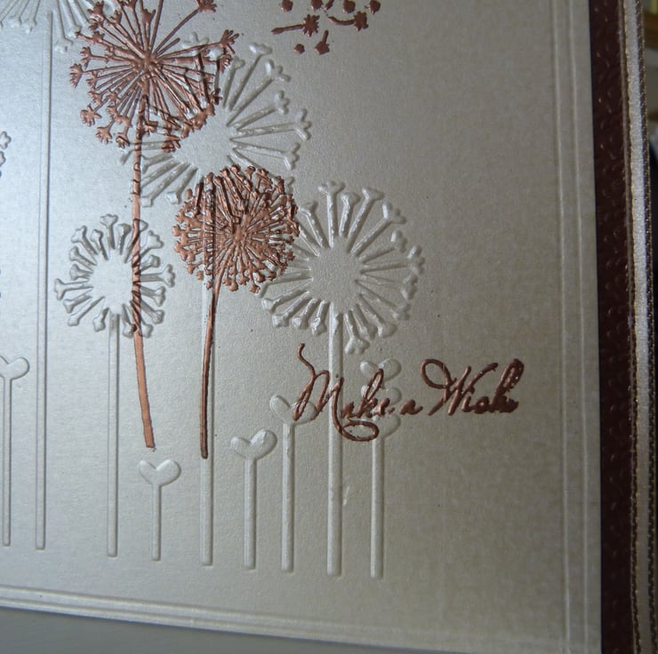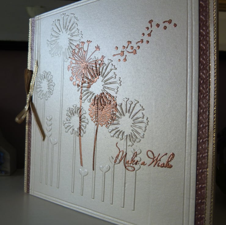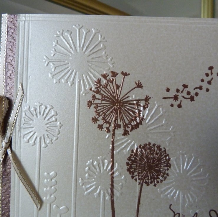 Beautiful images of dandelions, embossed, stamped and heat embossed in copper onto beige pearl card. Make a wish stamped and heat embossed in copper. All mounted onto embossed brown card and then mounted onto quality cream card. Side edges of the card finished off with gold edged beige ribbon and bow. Beige parchment paper insert left blank for your own personal message.