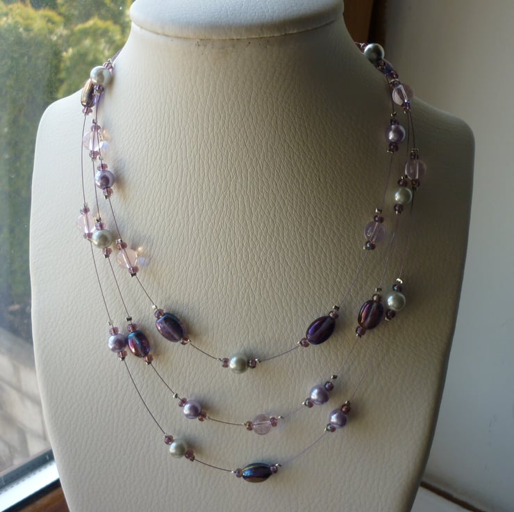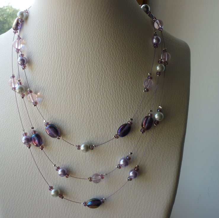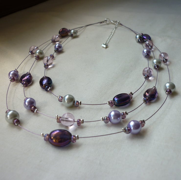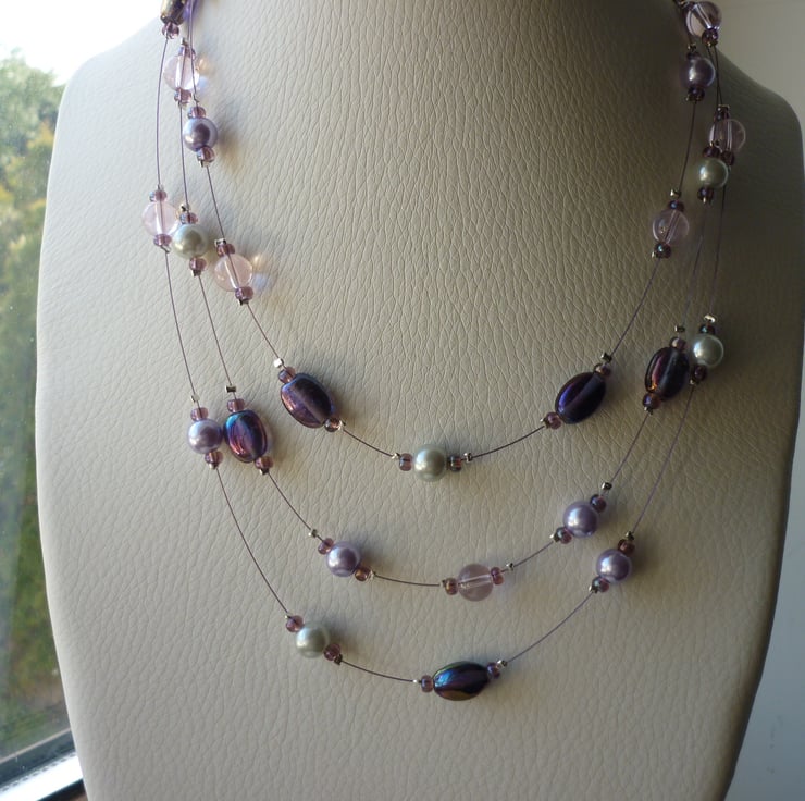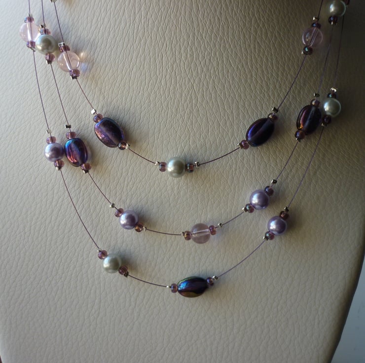 THE NECKLACE HAS BEEN MADE WITH A SELECTION OF GLASS BEADS, PEARLS AND SEED BEADS IN SHADES OF PURPLES, LILAC, GREYS, PINKS AND SILVER AND ALL STRUNG ONTO PURPLE COLOURED TIGER TAIL BEADING WIRE AND FINISHED WITH SILVER PLATED LOBSTER CLASP, EXTENSION CHAIN AND FINDINGS.