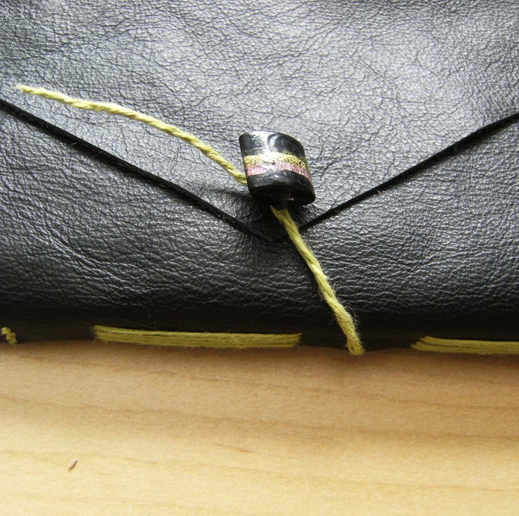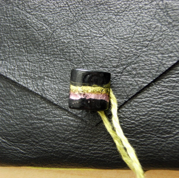 The cover is high quality leather, in black with a natural-grained finish. It will last well and won't stretch or sag; I have left the cover unlined, to make the most of its quality. It has a wrap-over flap, which fastens with a black & coloured dichroic glass button and a green linen string.