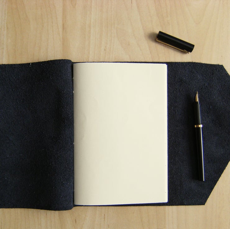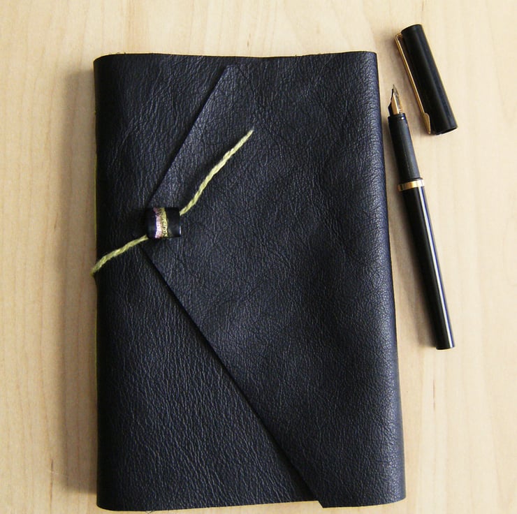 A slim journal or notebook, covered in soft black leather and hand bound with care.