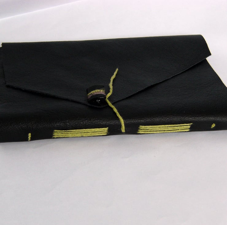 The book is bound in Longstitch, in lime green Austrian linen thread, which matches the button-and-string fastening. The wrap-over flap is cut in an attractive asymmetric-shaped point.