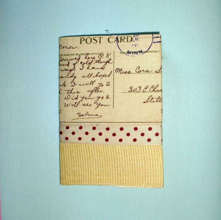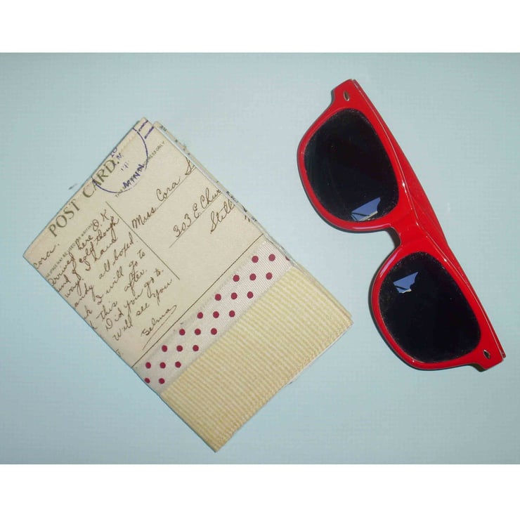A fun passport cover, made from two fabrics, one a subtle stripe and the other featuring vintage postcards. There is a spotted ribbon between the two fabrics. It is fully lined, and interfaced to protect your passport. The lining is plain pale cream fabric, it fits a standard UK passport.