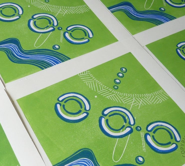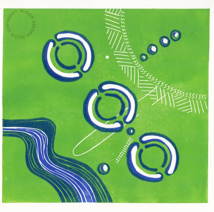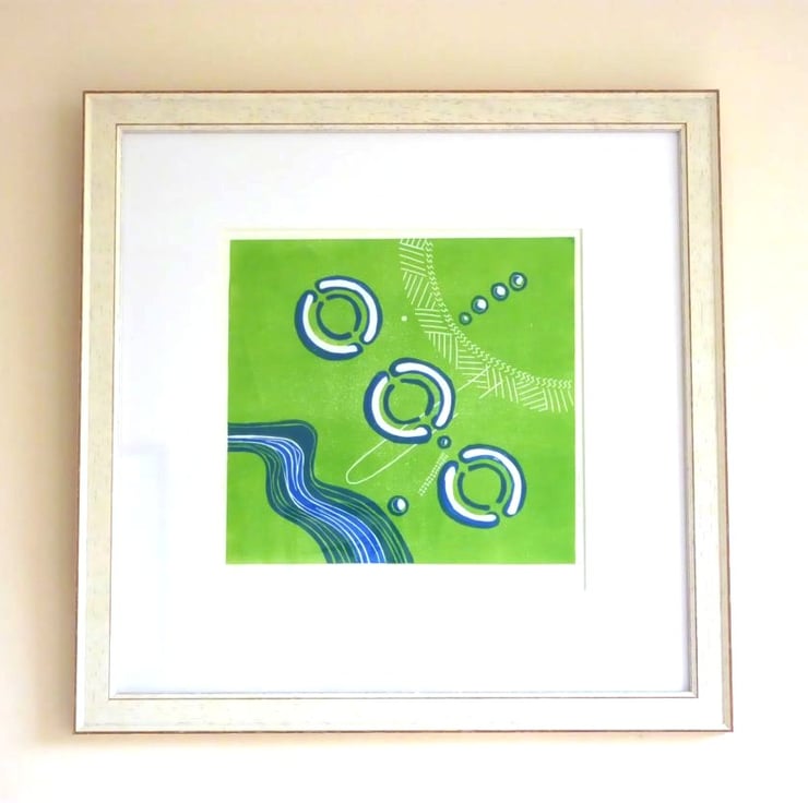 This is an original lino print printed from two blocks, one for the green, the other for the blue. A limited edition of 20. The printed area measures approximately 25x25cm and it is supplied in a mount to fit a 30x30cm frame. If you require a mount to fit a larger frame do contact me for costs.