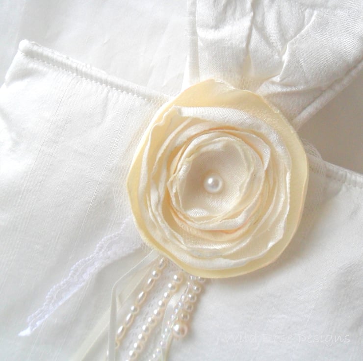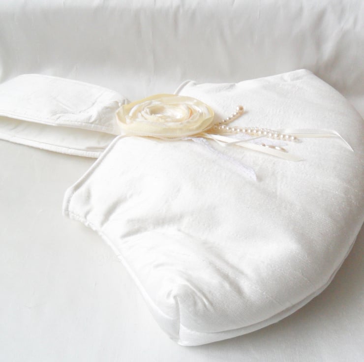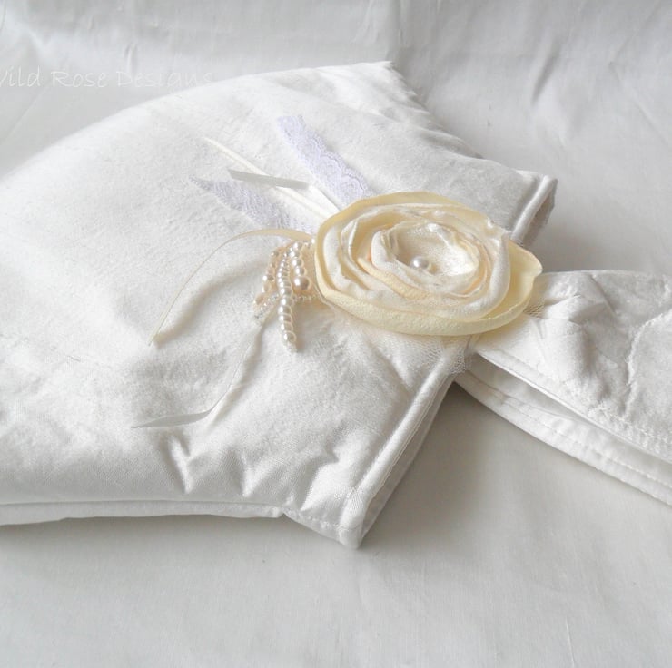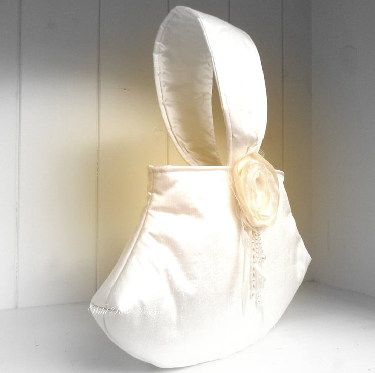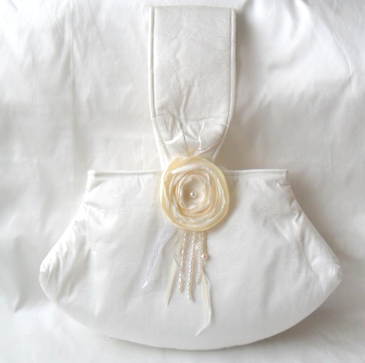 A beautiful handmade Wedding bag made in an ivory silk dupion and lined in ivory silk. It has a wrist strap, leaving your hands free, and closes with a magnetic snap. Inside there is a handy slip pocket. The front of the bag is finished with a handmade satin rosette in ivory and cream, and is trimmed with faux pearls, ribbons and lace