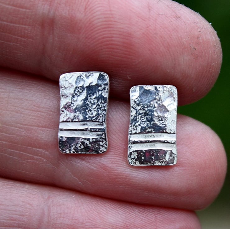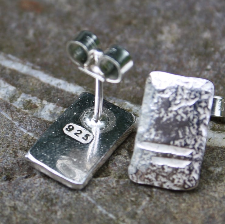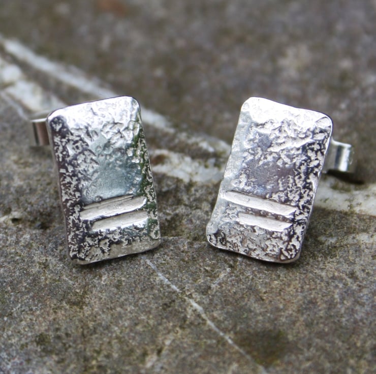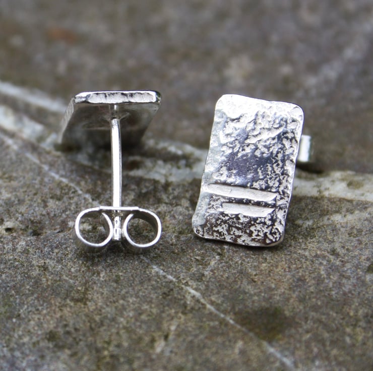 Small little rectangular sterling silver studs with a hammered texture.Burnished to a bright finish.