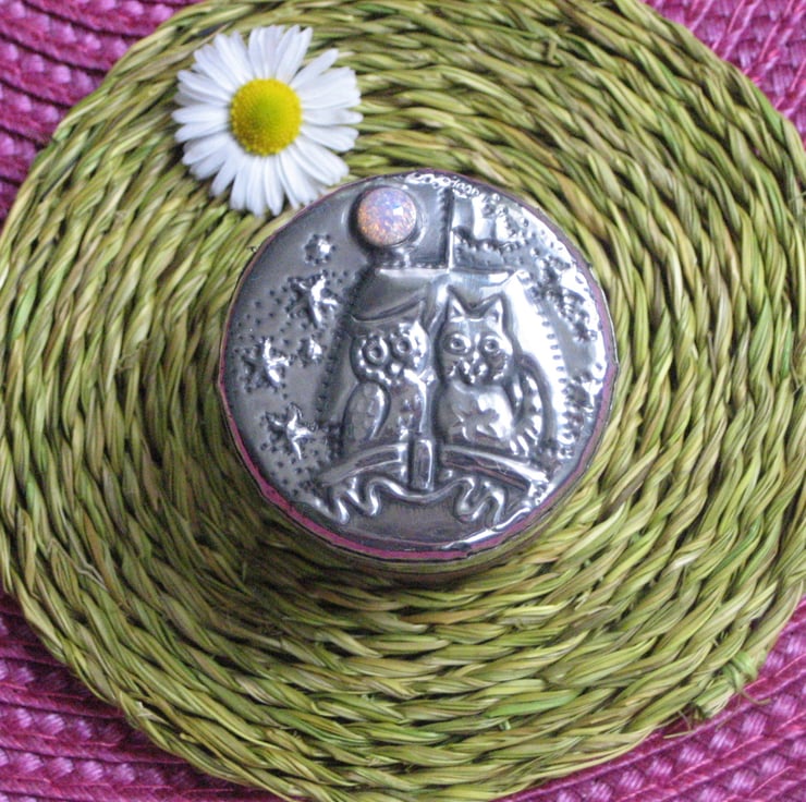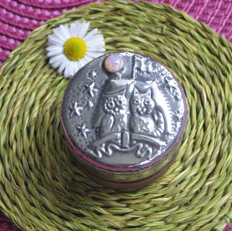 This little rustic wooden box has been transformed with a lid of hand-crafted pewter. The romantic duo sail beneath a moon of sparkly synthetic opal. The box measures 39mm (1.5ins) across and is 30mm(1.25ins) high.