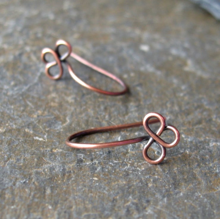Beautifully finished handmade antique copper wire earwires with a trefoil design, each one approximately 17mm from top of earwire to bottom of trefoil. Made from 0.8mm wire with smoothed ends to ensure comfort when wearing. They are carefully made and shaped by hand, filed and polished, hammered and tumbled for strength and shine. Then they are oxidised for an antique finish and polished.