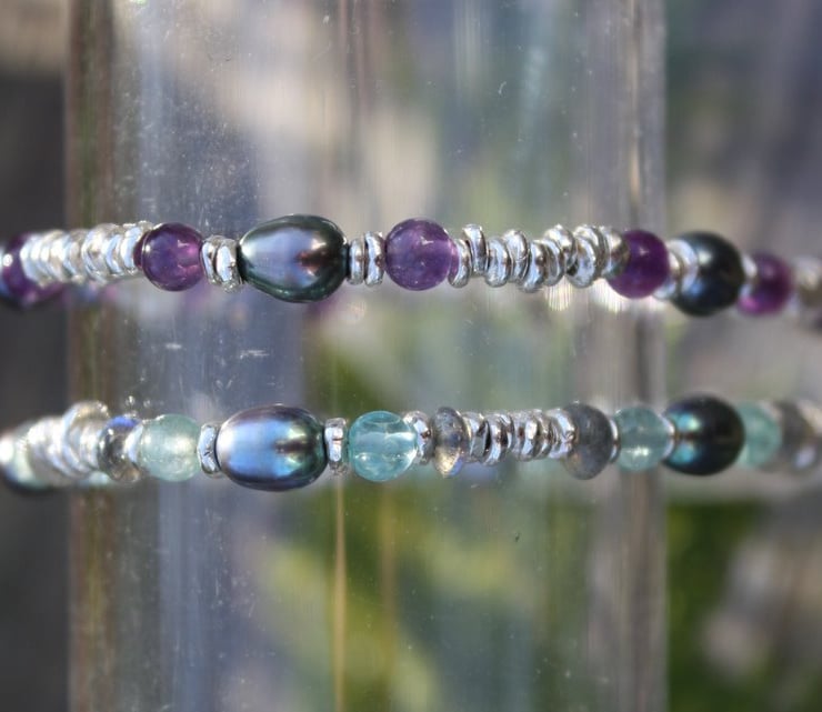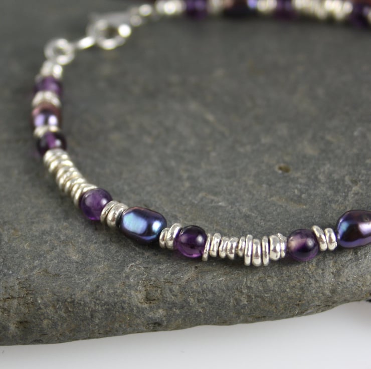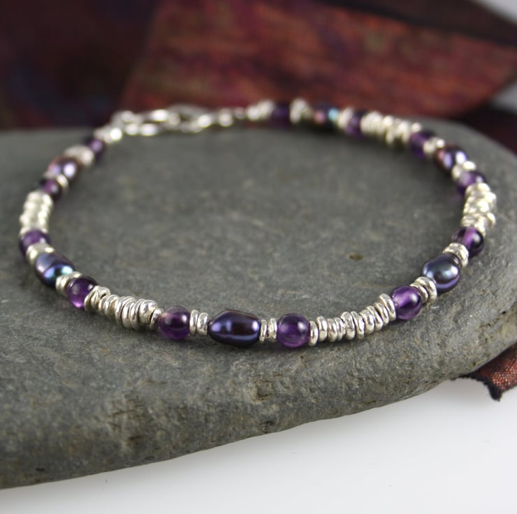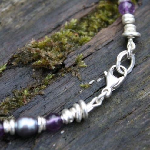A beautiful silver bracelet with amethysts and iridescent purpley black pearls.