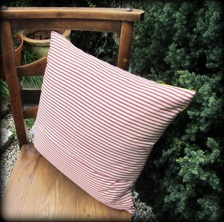This cushion measures 42cm x 42cm, and is backed with a stripy red and cream polycotton fabric. The cover is removable, via a deep envelope opening on the back.