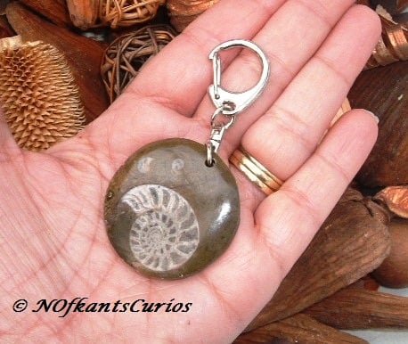A superb little, highly polished, round shaped Keyring, or handbag charm, which has a lovely little fossil ammonite at its centre.