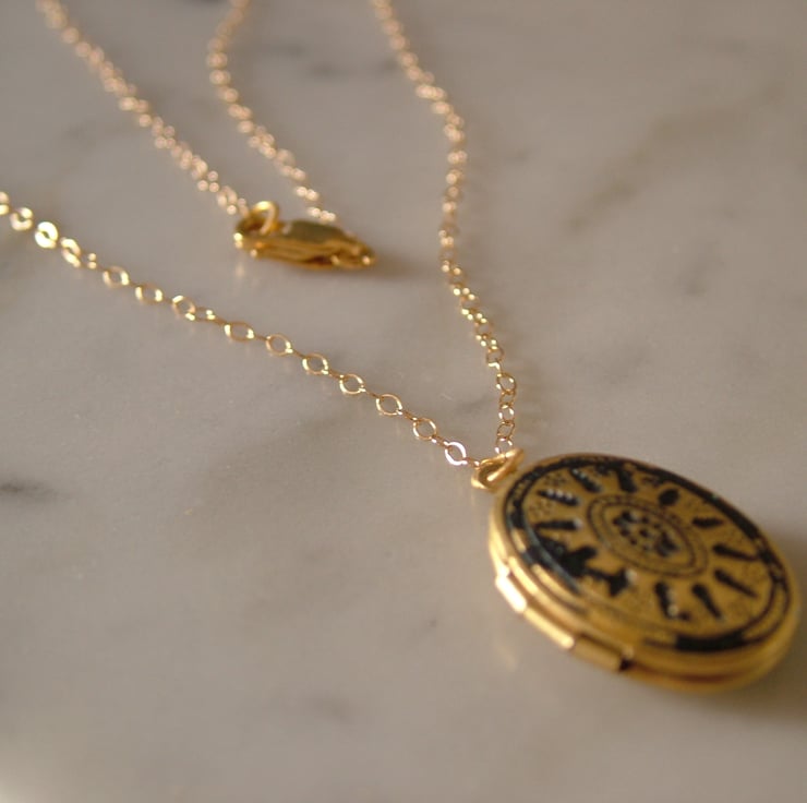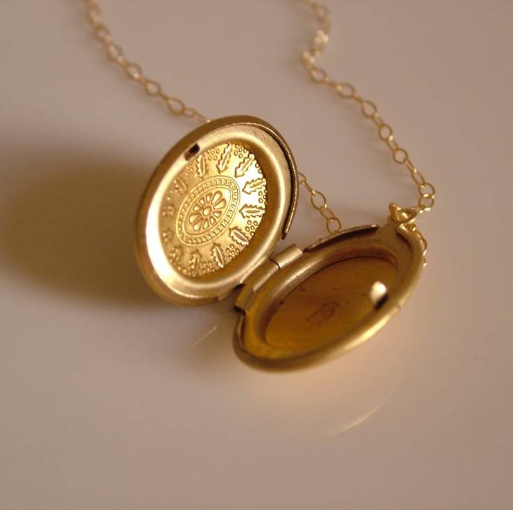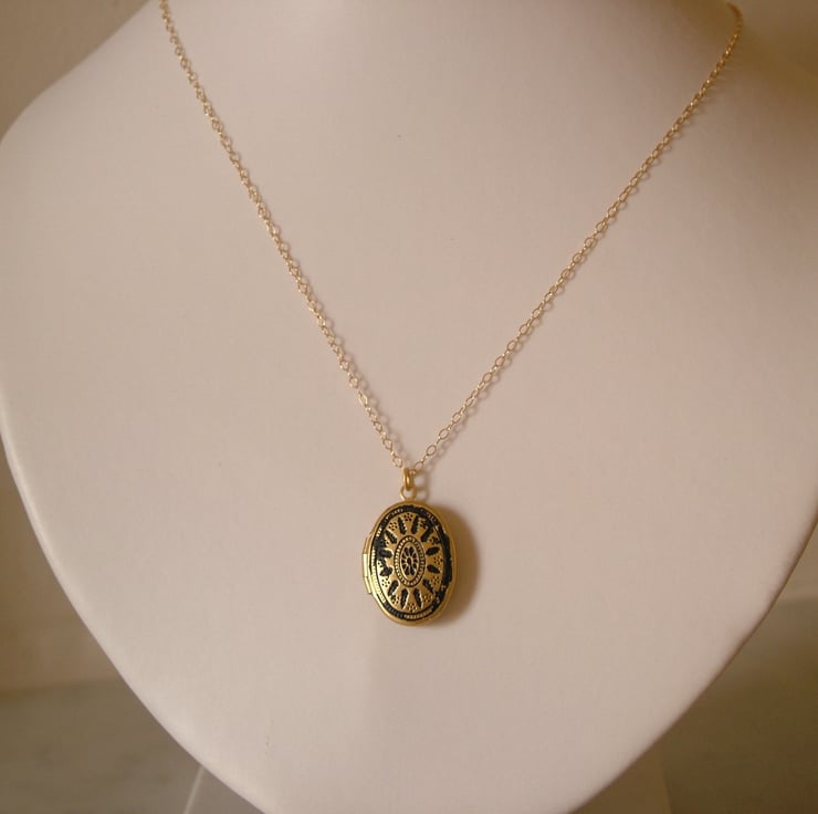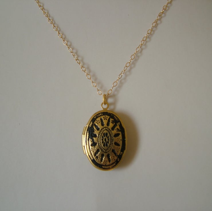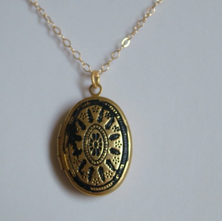 A lovely oval patina brass locket. (Ebony and Brass) hanging from a 14K gold filled chain with vermeil lobster clasp.