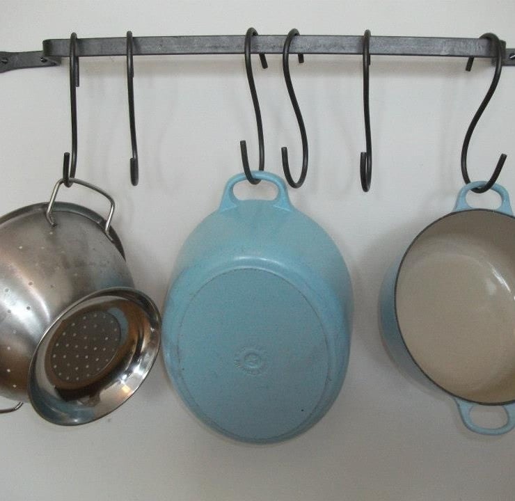A short, wall mounted pot rack with 6 S hooks and matching, black screws. Matt, graphite finish.