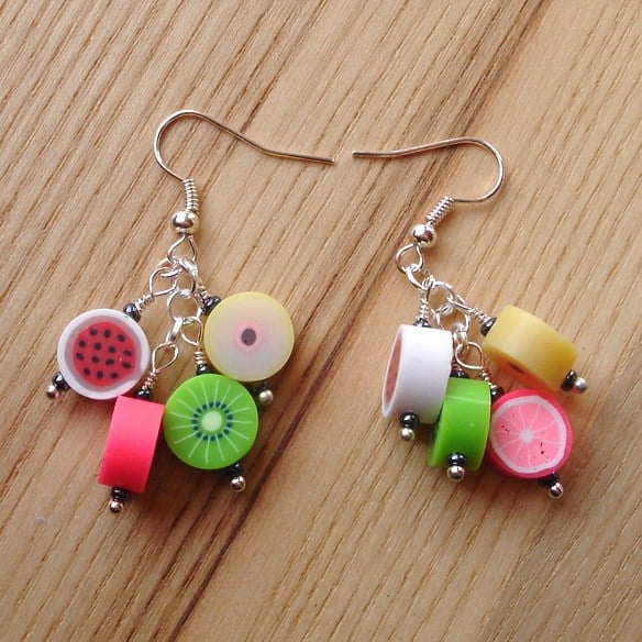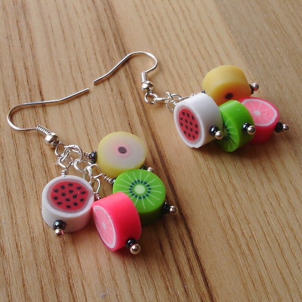 These cute earrings feature clusters of funky fruity fimo beads. They are hung on silver plated headpins and finished off with teeny black lustre glass seed beads. Really kitsch and fun to wear.